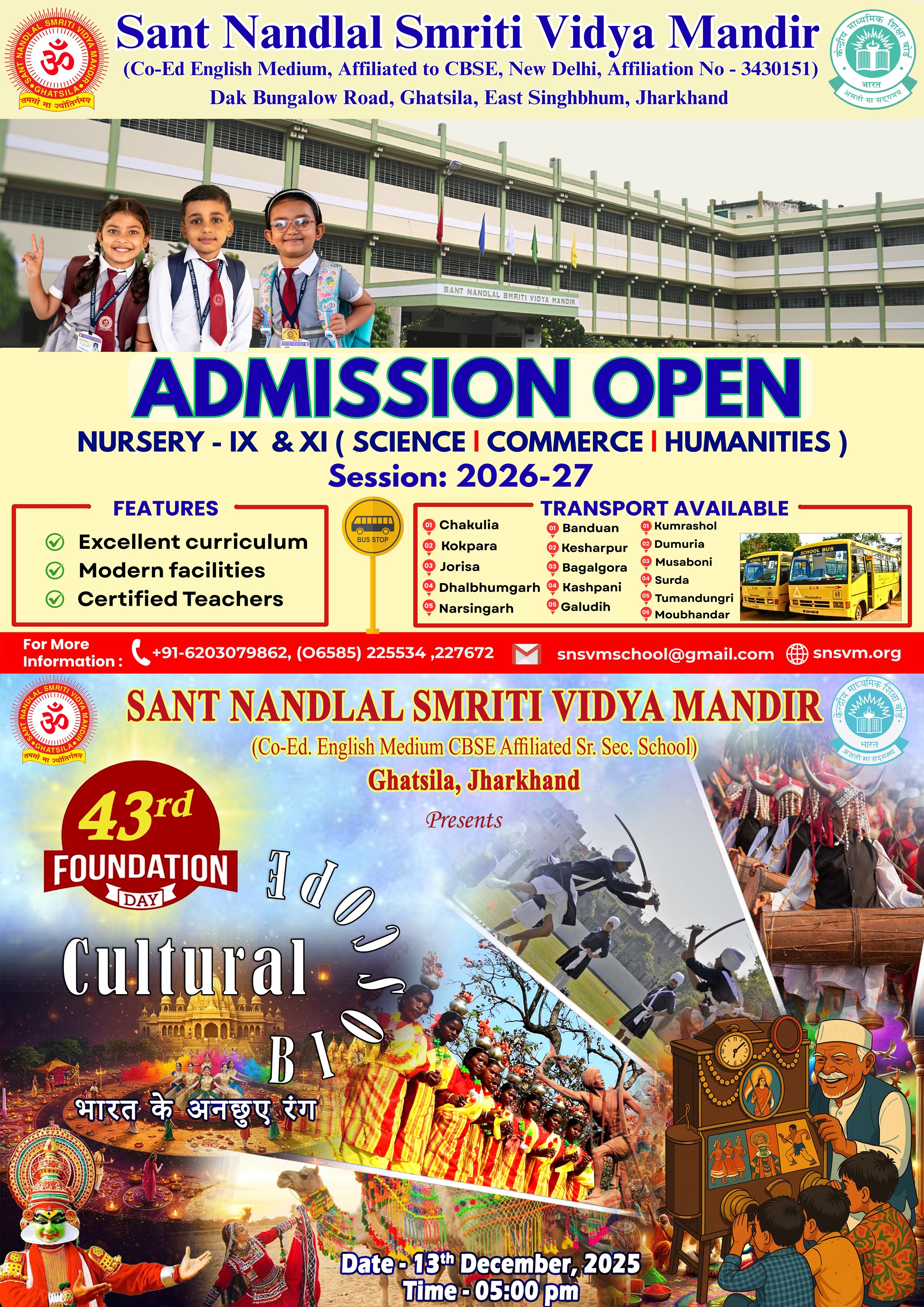 At Sant Nandlal Smriti Vidya Mandir, Ghatsila, we don’t just provide education – we nurture values, character, and lifelong skills. What makes us different is our commitment to holistic development, where academics, co-curricular activities, and life skills go hand in hand.