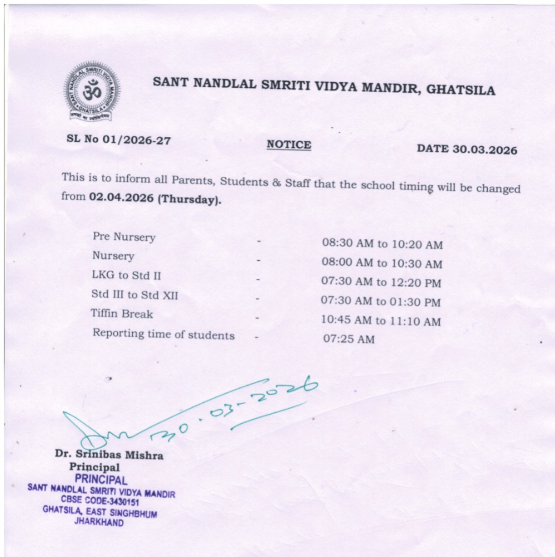 SCHOOL TIMING W.E.F 02/04/2026
